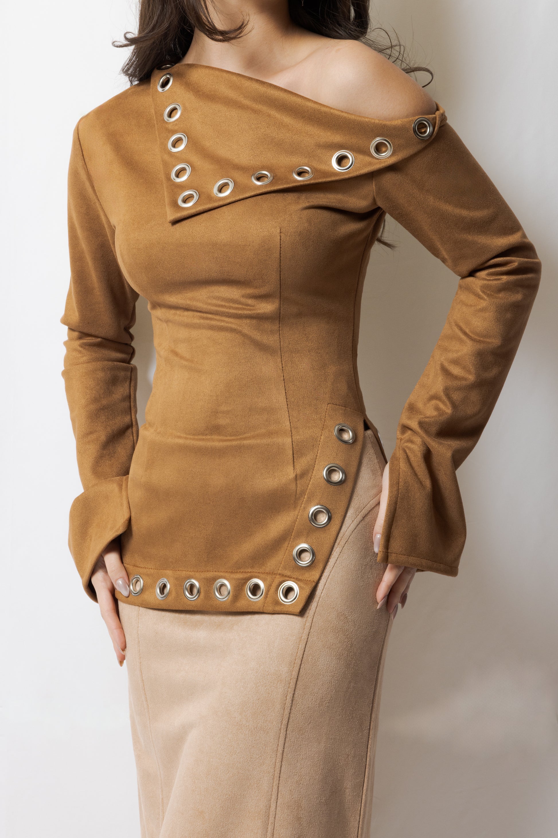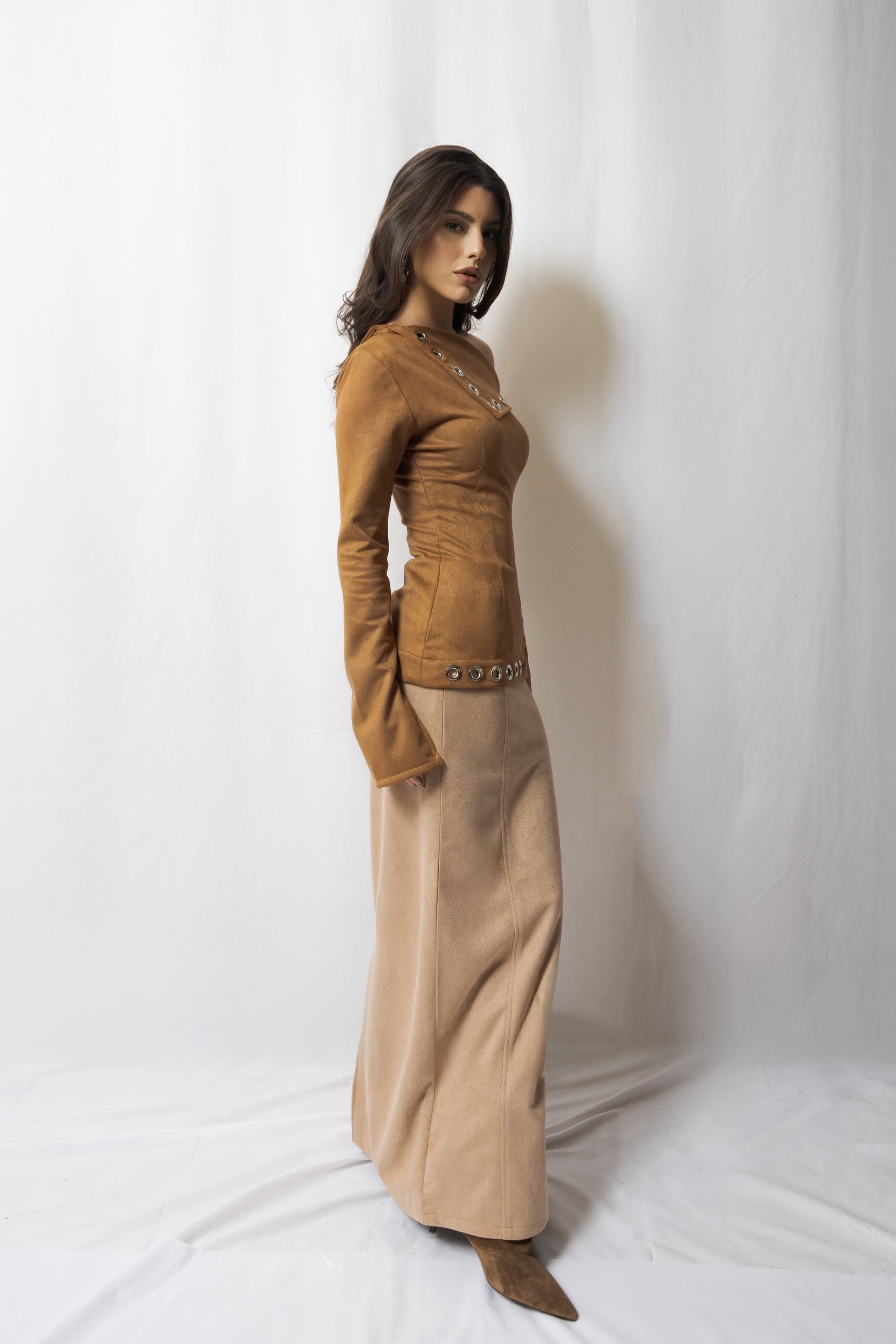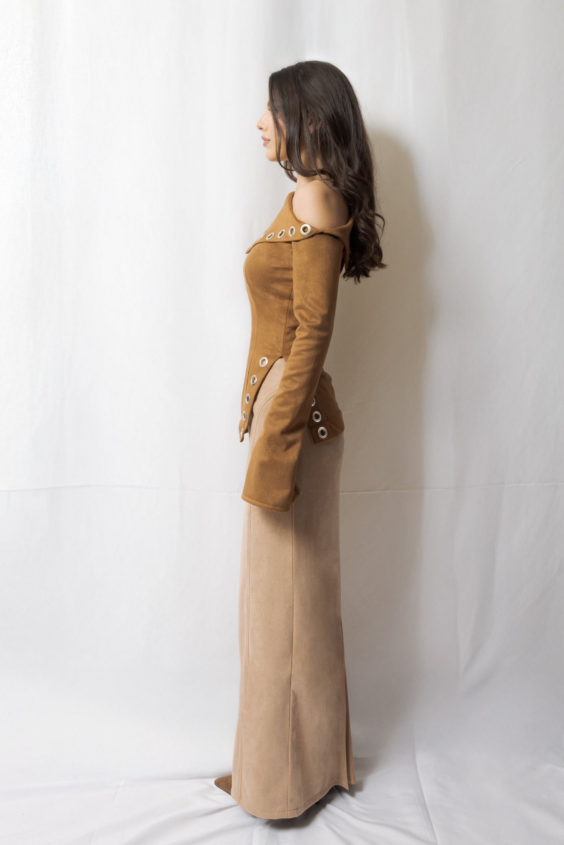 From the Ratnapura collection. Channeling the warm, radiant energy of the Citrine stone, this set blends earth tones with industrial precision. Crafted from buttery, high-stretch suede, the tunic in deep camel is paired with a sleek maxi skirt in warm sand. The look is finished with a striking asymmetric neckline and high side slit, edged with silver grommets for a flash of metallic structure.