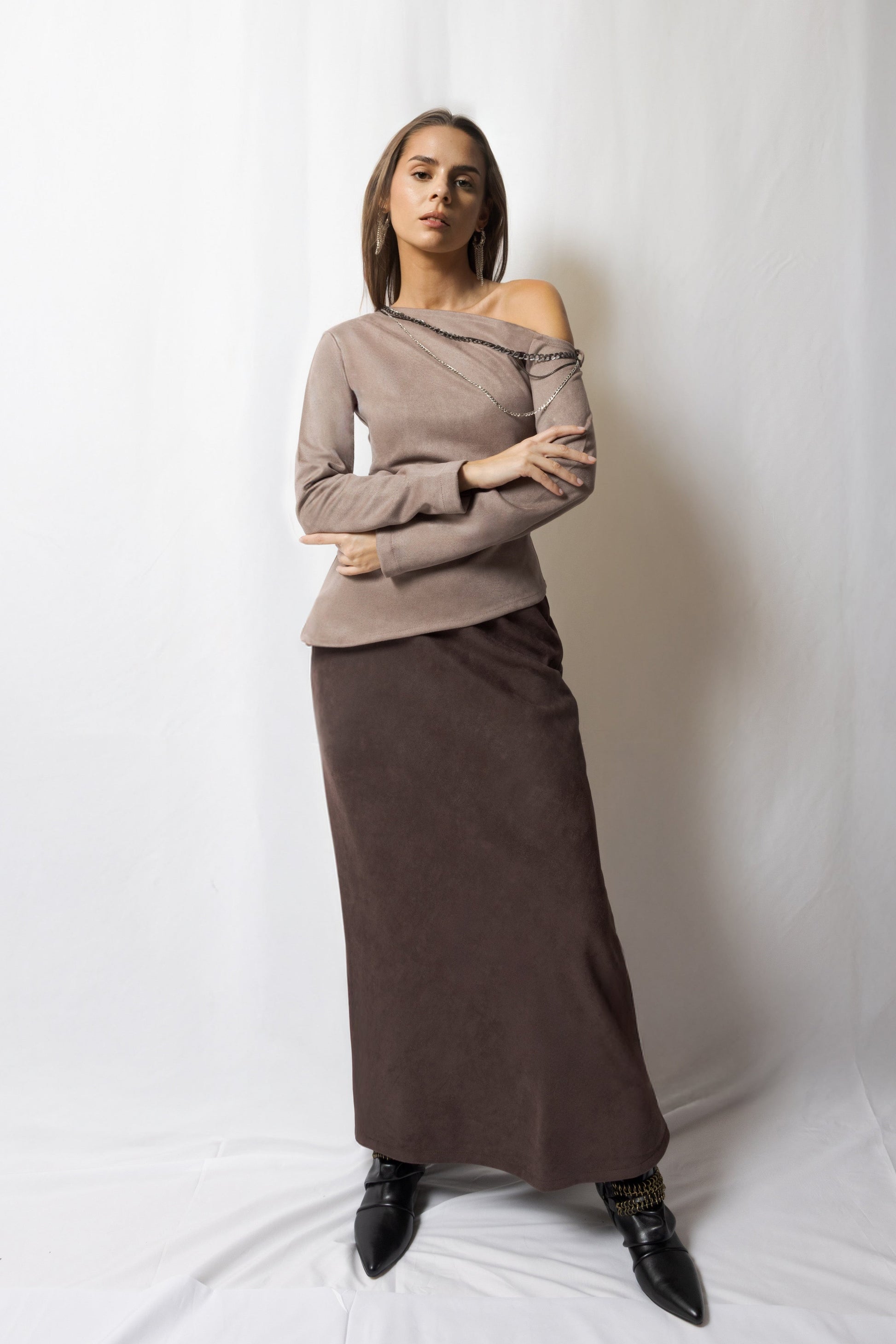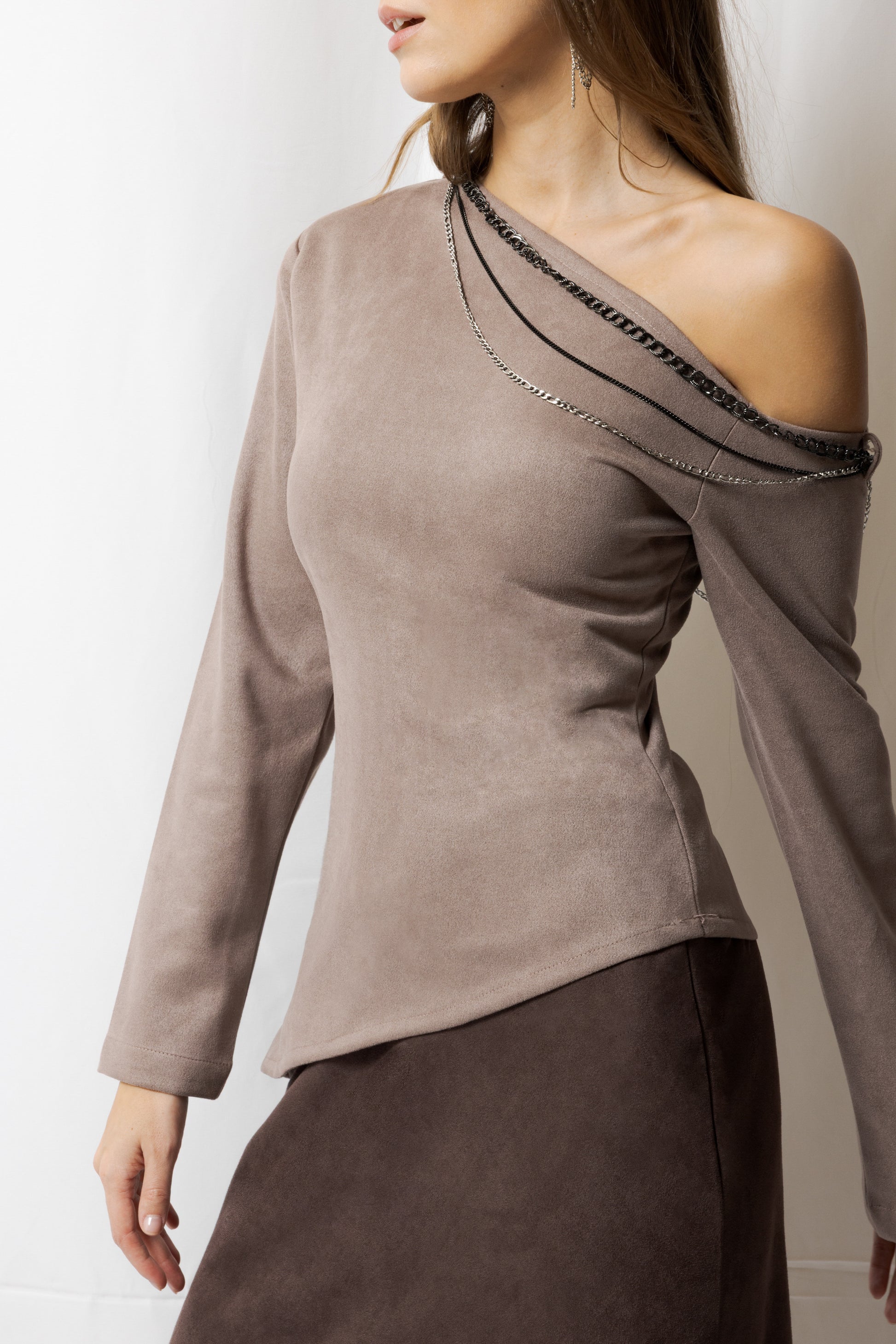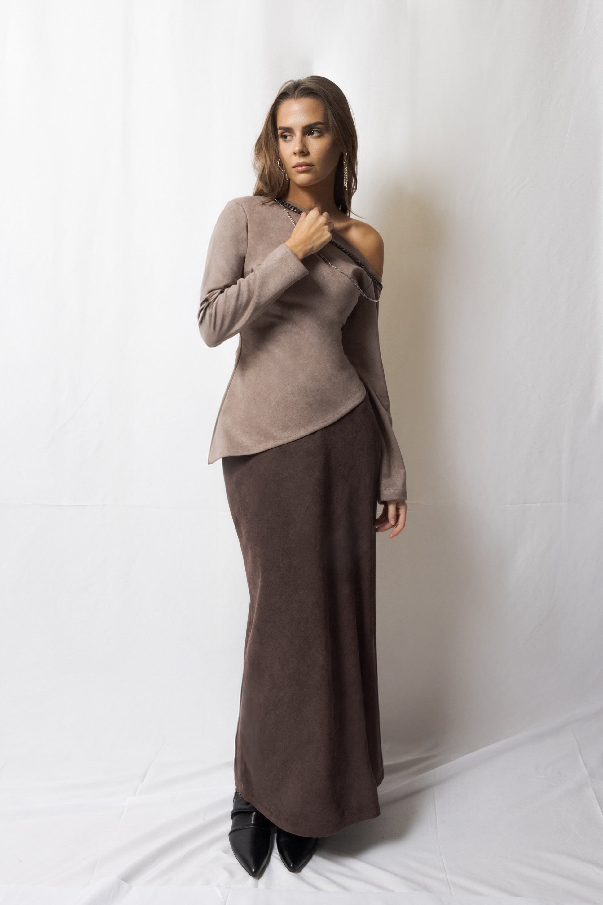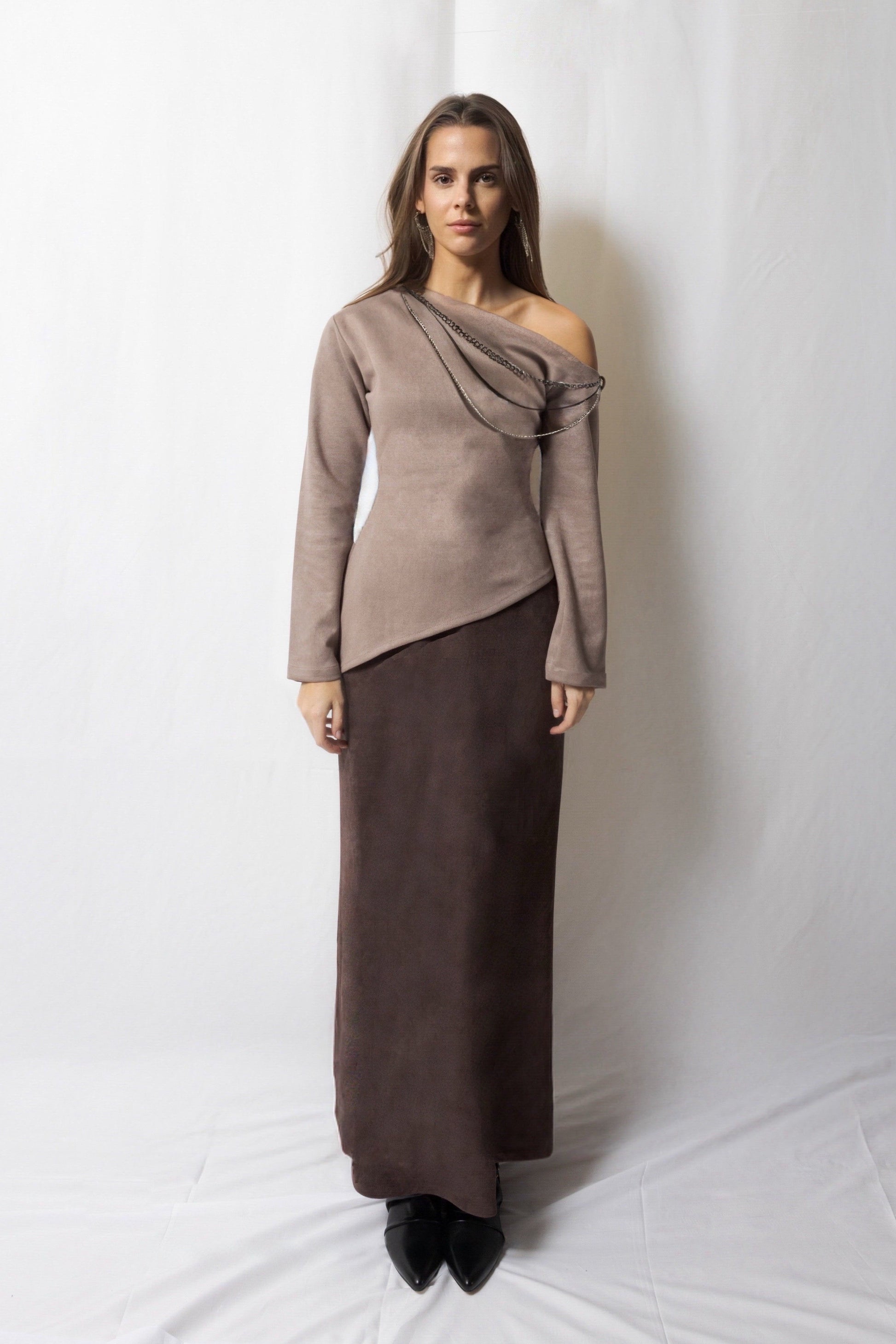 From the Ratnapura collection. Inspired by the organic, earthy tones of the Moonstone, this set masters the balance between soft comfort and industrial edge. Cut from buttery, high-stretch suede, the top features a sculptural asymmetric neckline draped with three distinct stainless steel chains in gunmetal, silver-black. Creating a jewelry-like finish built directly into the garment.