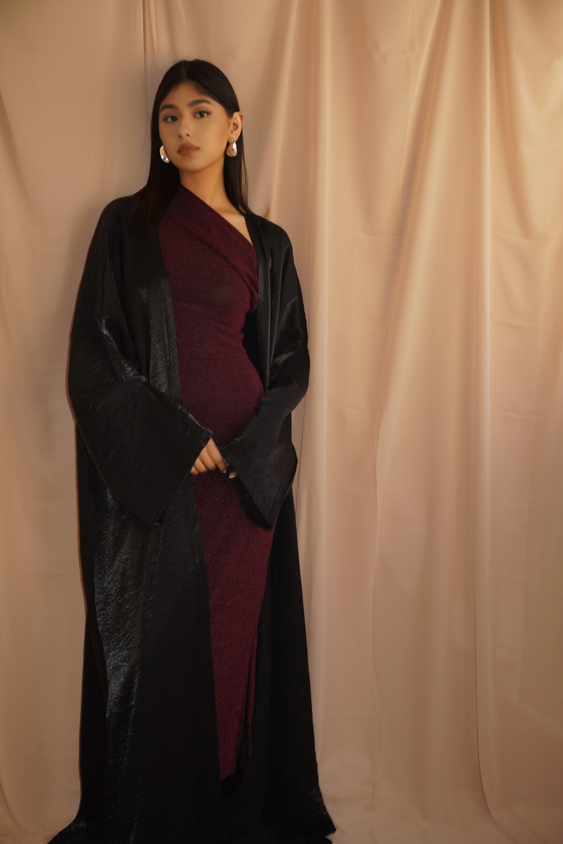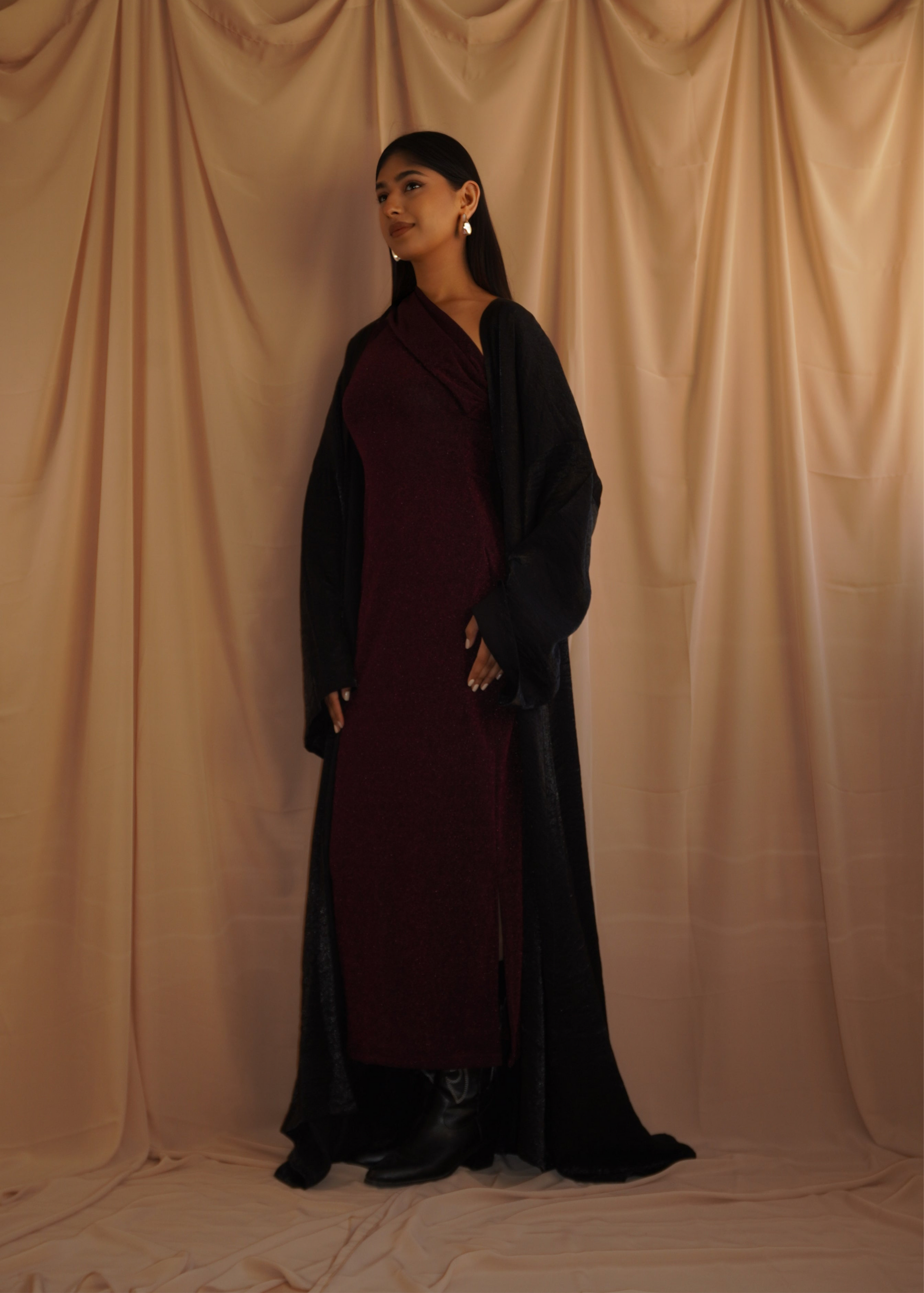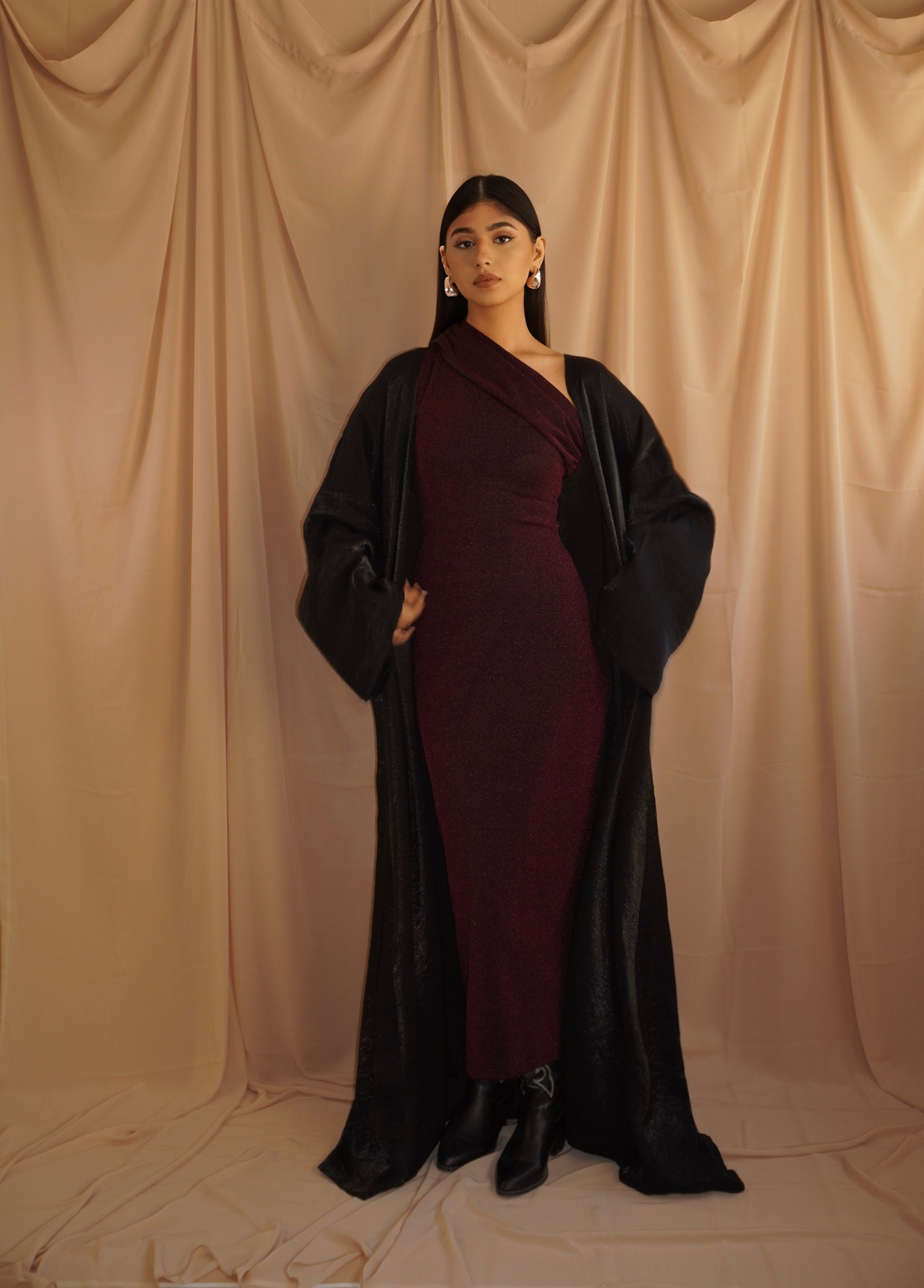 2-piece Dara’a. Stretchy glittery bodycone dress, with a glossy black Besht.