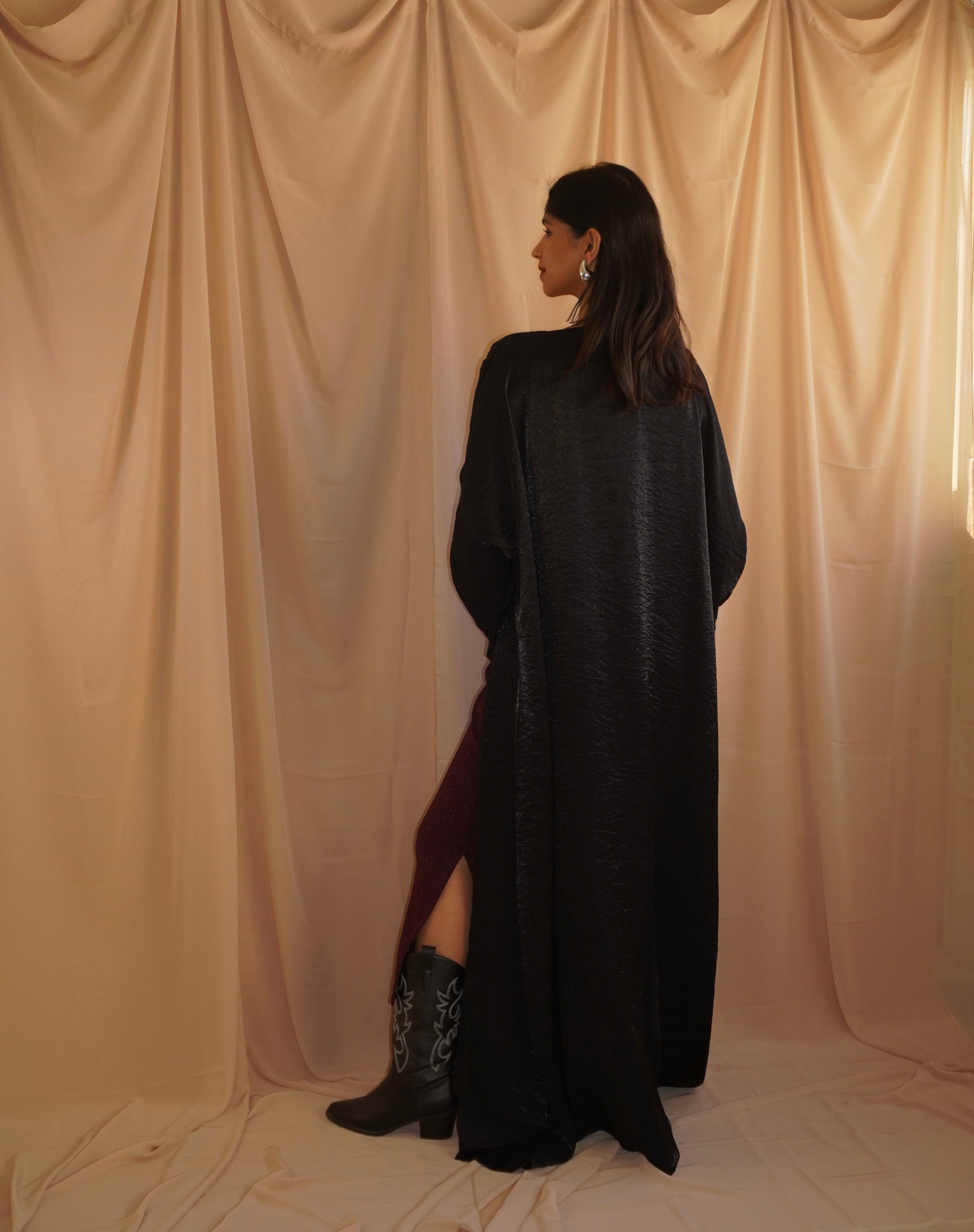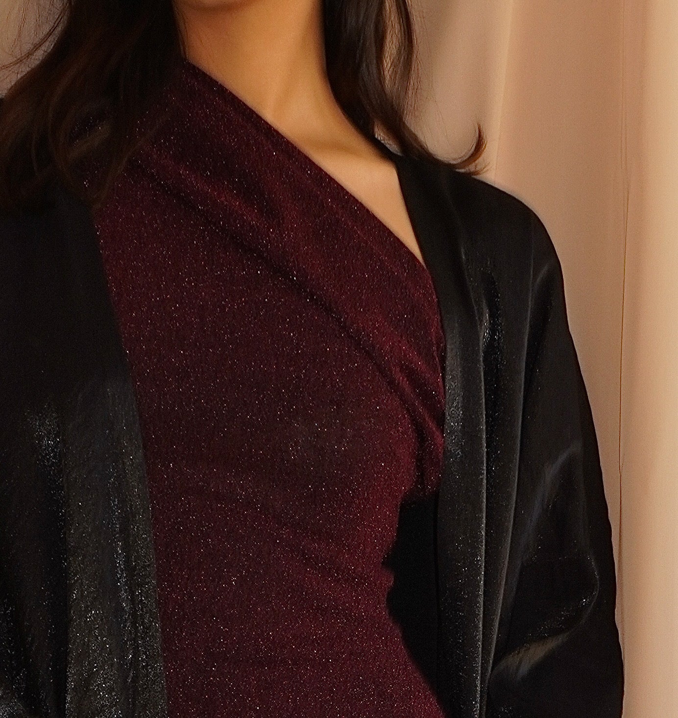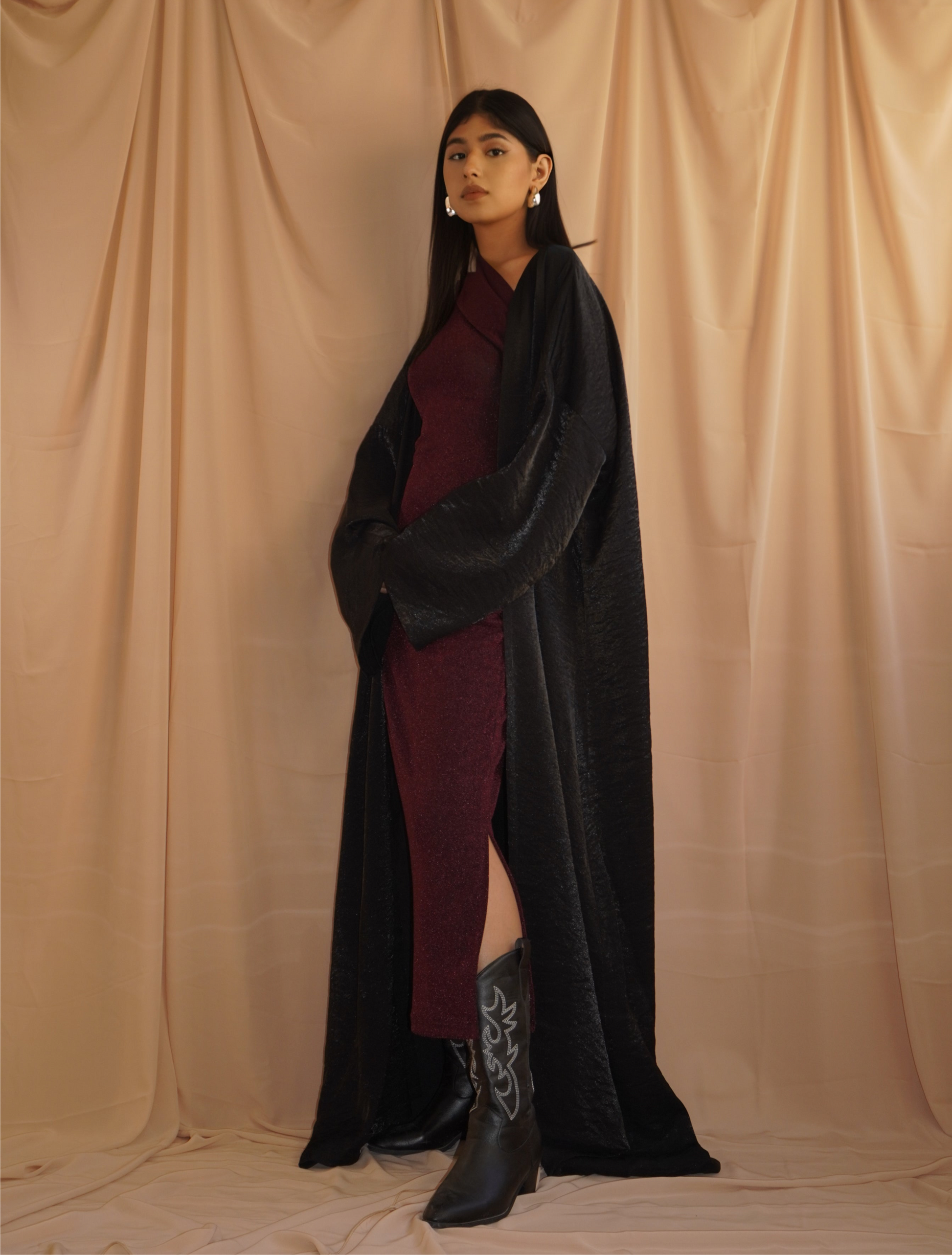 2-piece Dara’a. Stretchy glittery bodycone dress, with a glossy black Besht.